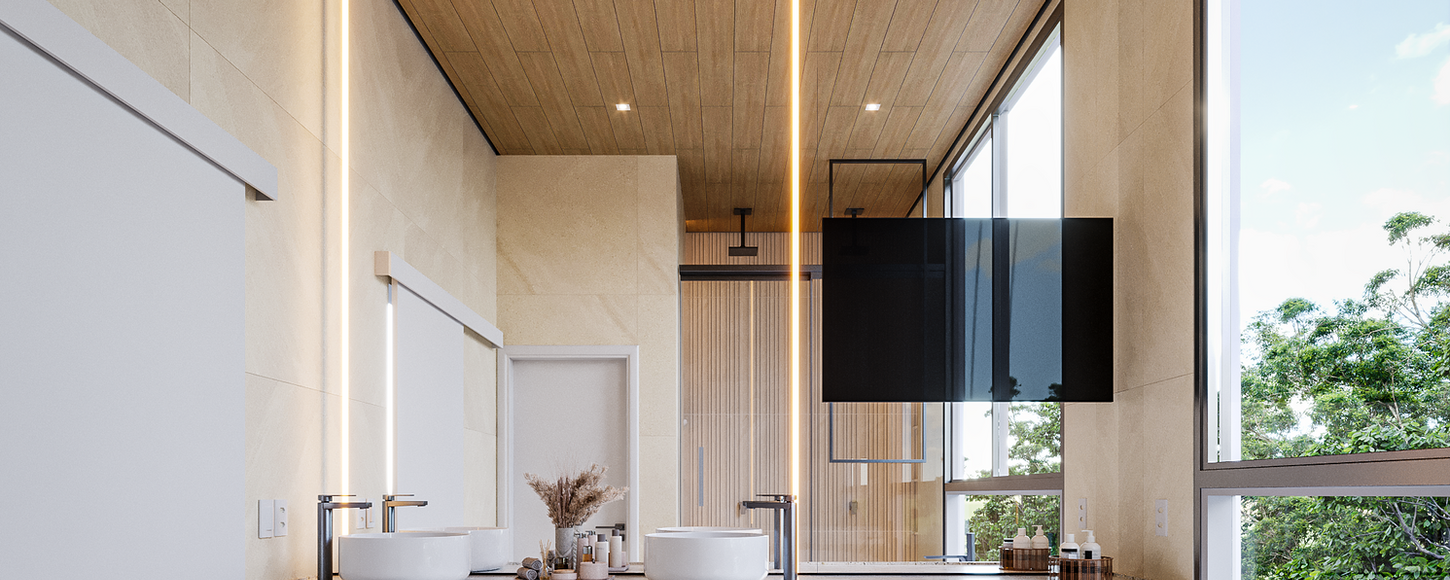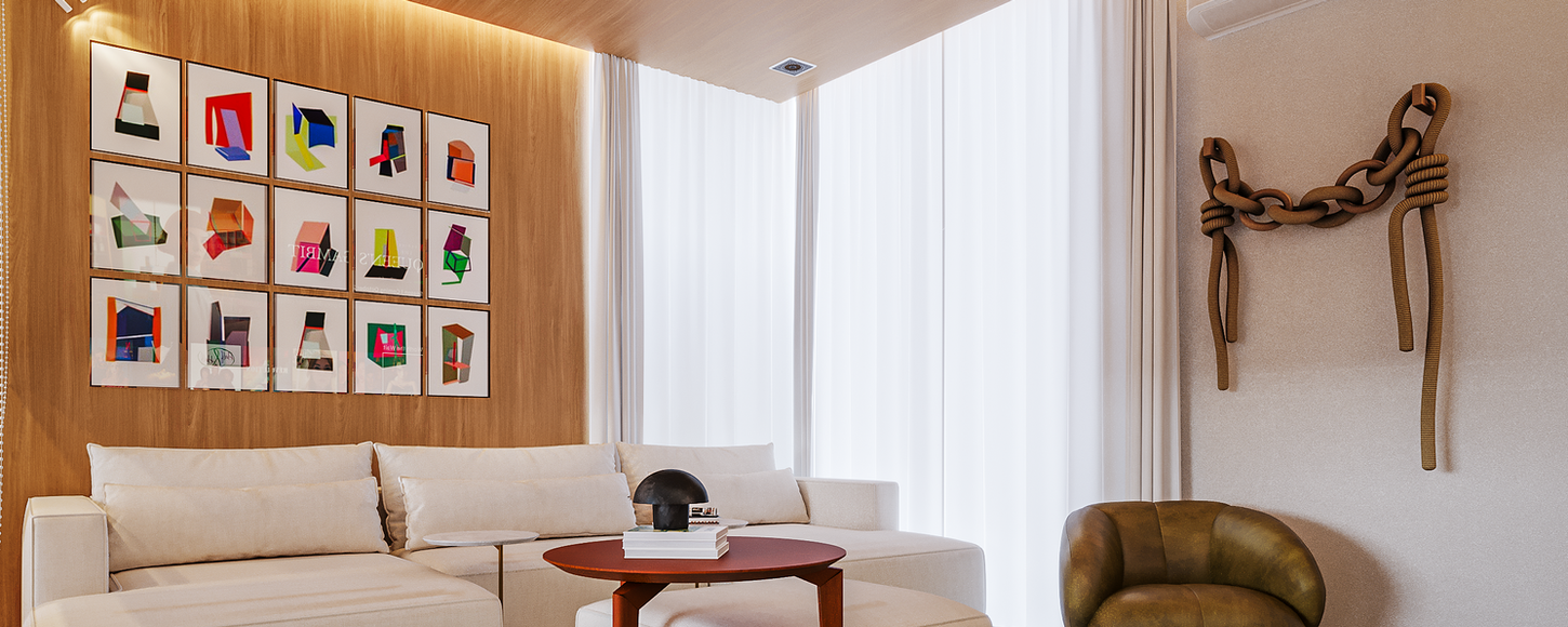 Para momentos de descontração, o home theater foi projetado como um refúgio de lazer, enquanto a suíte master transmite serenidade através da paleta neutra, da madeira envolvente e da iluminação suave.